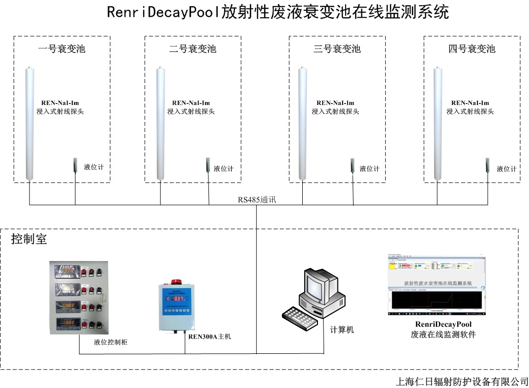 本系統(tǒng)是以工控機(jī)或商業(yè)臺(tái)式計(jì)算機(jī)作為上位機(jī),以若干液位測(cè)控儀和若干REN300在線輻射安全報(bào)警儀及射線探頭為下位機(jī),通過(guò)屏蔽電纜線組成一個(gè)RS-485通訊網(wǎng)絡(luò)。在線監(jiān)測(cè)系統(tǒng)軟件是整套系統(tǒng)的大腦,由其完成全部系統(tǒng)的自動(dòng)化控制過(guò)程。